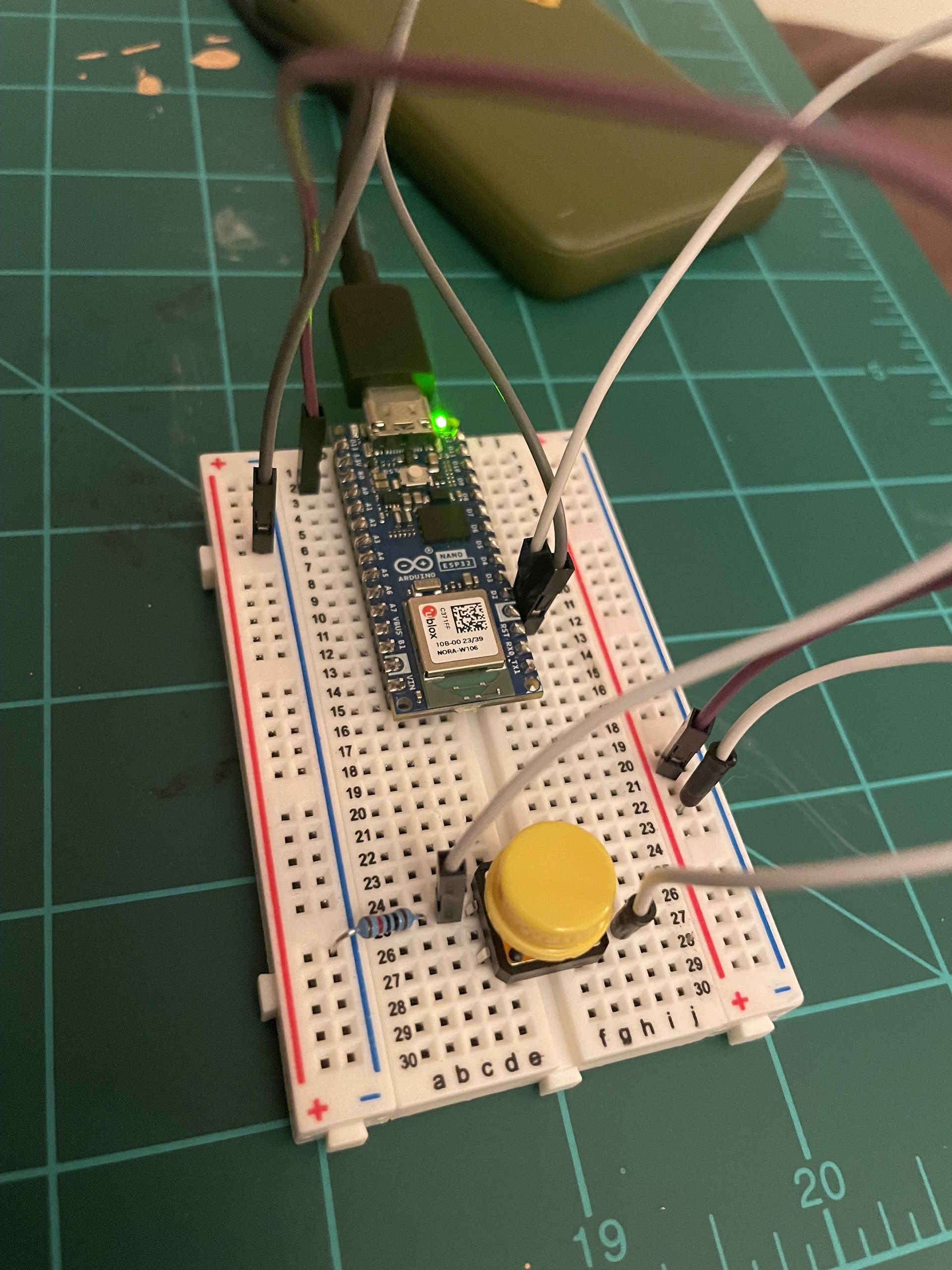 In this video, I am showcasing a Bluetooth enabled keyboard controller for any device that accepts Bluetooth connections such as this iPhone or an iPad. The current setup shows an Arduino ESP32 connected to my iPhone through bluetooth. On this breadboard the ESP 32 is wired to a yellow tactile push button and when I press this button it sends the word hey to my phone which currently has the notes app open. The code is based on a Bluetooth keyboard library. The program shows the set up for naming the Bluetooth device and the main function that detects whether the yellow button is pressed. wh en it's pressed it sends a command to send the keys to type the word “hey”.